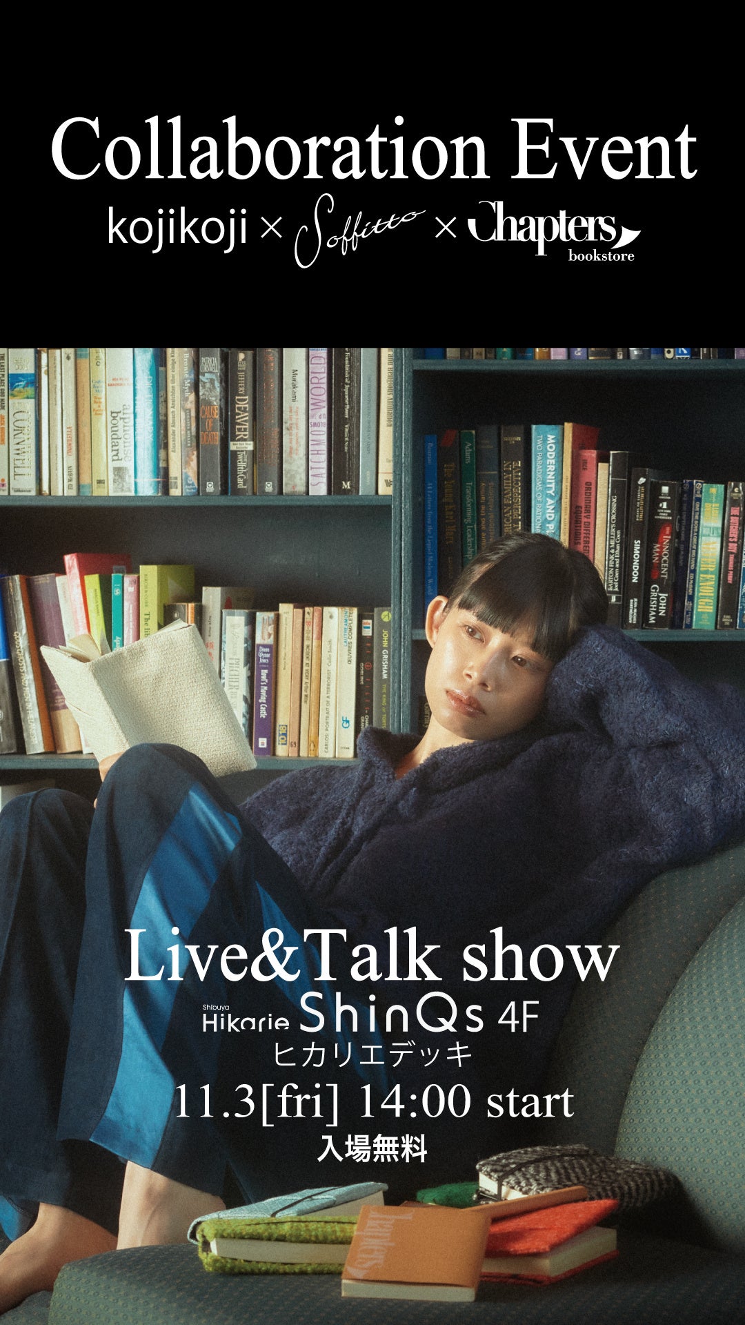 Chapters書店の書店主・森本萌乃より、今回のコラボにかけた思いや今月の選書について、2-30代の働く女性にお勧めの本をご紹介するトークイベントと、kojikojiが新曲「金柑」を含む3曲を披露するミニライブは、チケットや事前お申込み不要、どなた様も無料でお楽しみ頂けます。秋のお出かけに、ご来場をお待ちしております。
