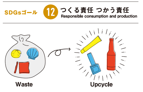 SDGsの17の目標のうち、アップサイクルと一番関わりが強いのが、目標12「つくる責任 つかう責任」。このエリアを通して「他人ゴトではなく自分ゴト」のきっかけになればと今回企画。