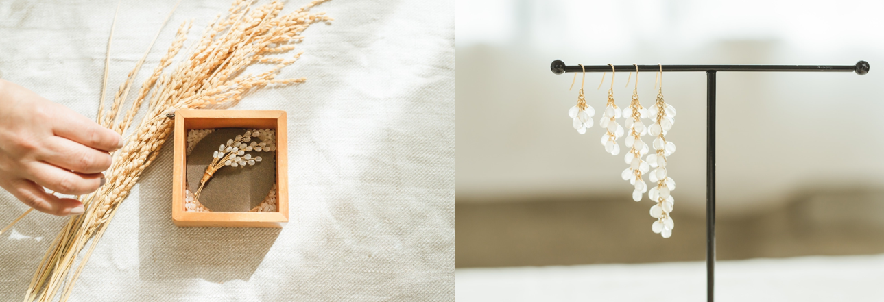 豊かな自然がつくりだす様々な「実り= crop」。お米・ごま・お豆・とうもろこしなど穀物を素材の持ち味を最大限に引き出せるよう、ひとつひとつ丁寧に手仕事を加え制作するアクセサリー。廃棄処分するものや、消費期限切れで商品価値が下がってしまった穀物を積極的に取り入れ、アップサイクル商品も展開している。