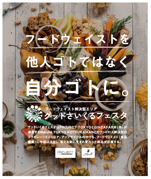グッドさいくるフェスタはPROJECT TOKYOとGINZAFARM株式会社が運営するMarché TOKYO KOTSUKAIKANとのフードロス解決型のコラボレーションエリア。アップサイクルの中でも、フードウェイスト(食品廃棄)に今回は注目し、新たな命に生まれ変わった商品が出展する。また、グッドさいくるフェスタのラウンジではバリ島の職人により作られている一点ものの家具を使用し、珍奇植物の展示販売も行う。