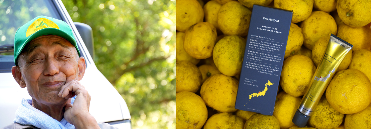 日本の文化・伝統を尊重し、全国各地の素材や伝統手工を織り交ぜ、“香り”のプロダクトを通して日本の魅力を後世に残す取り組みを行っているブランド。年に一度、石川県能美市のゆず農家で採れる貴重なオーガニックゆず。絞った後のゆず皮などの「捨てられていたモノ」から精油をとって作られたハンドクリームなどのコスメが並ぶ。