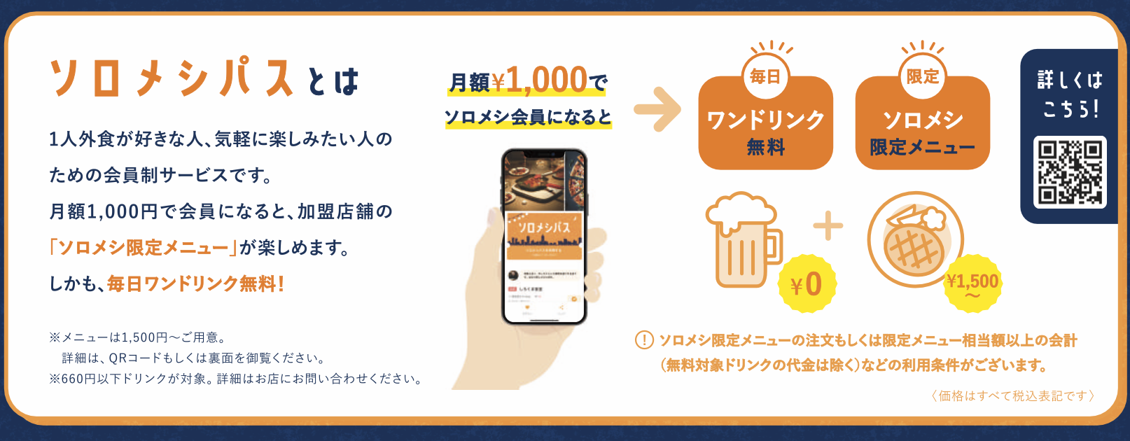 「ソロメシパス」とは、月額1,000円で会員になると加盟店舗の「ソロメシ限定メニュー(1500円〜)」が楽しむことができ、また、ワンドリンクが無料となる定額制のサービスです。人形町・水天宮エリアの飲食店21店舗(参加店舗は順次増えて参ります!)が1人でのご来店をより気軽に楽しめるようにお待ちをしています。