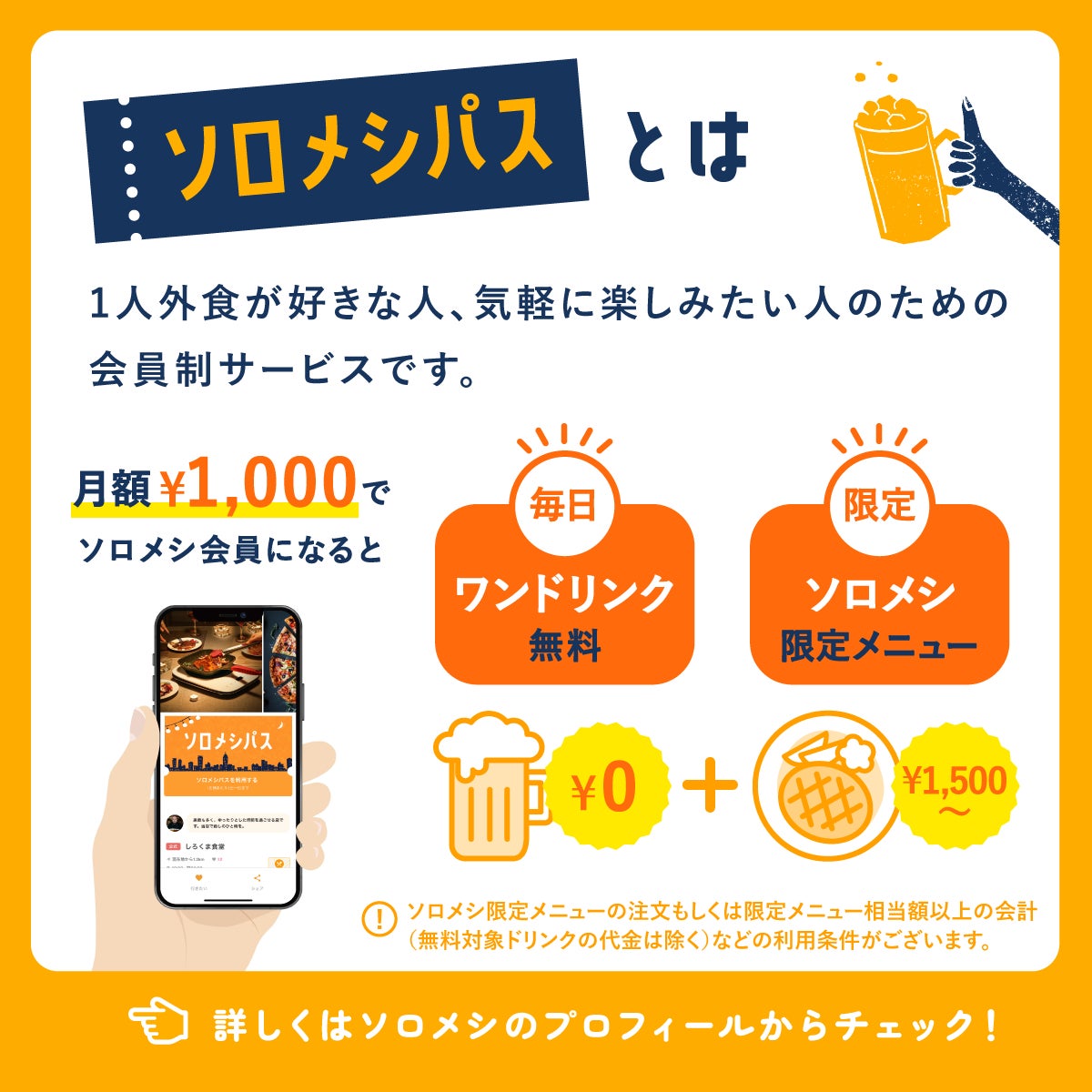※ワンドリンク無料は、660円以下もしくは店舗指定のドリンクが対象。ソロメシ限定メニューもしくは限定メニュー相当額以上をご注文のお客様が対象となります。