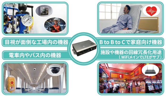 - 現地のWiFiネットワークでインターネットに接続ができる場所に設置される機器において、メインのインターネット接続をWiFiで行ない、ネットワーク障害の際のバックアップ用にLTEも通信可能にしておく