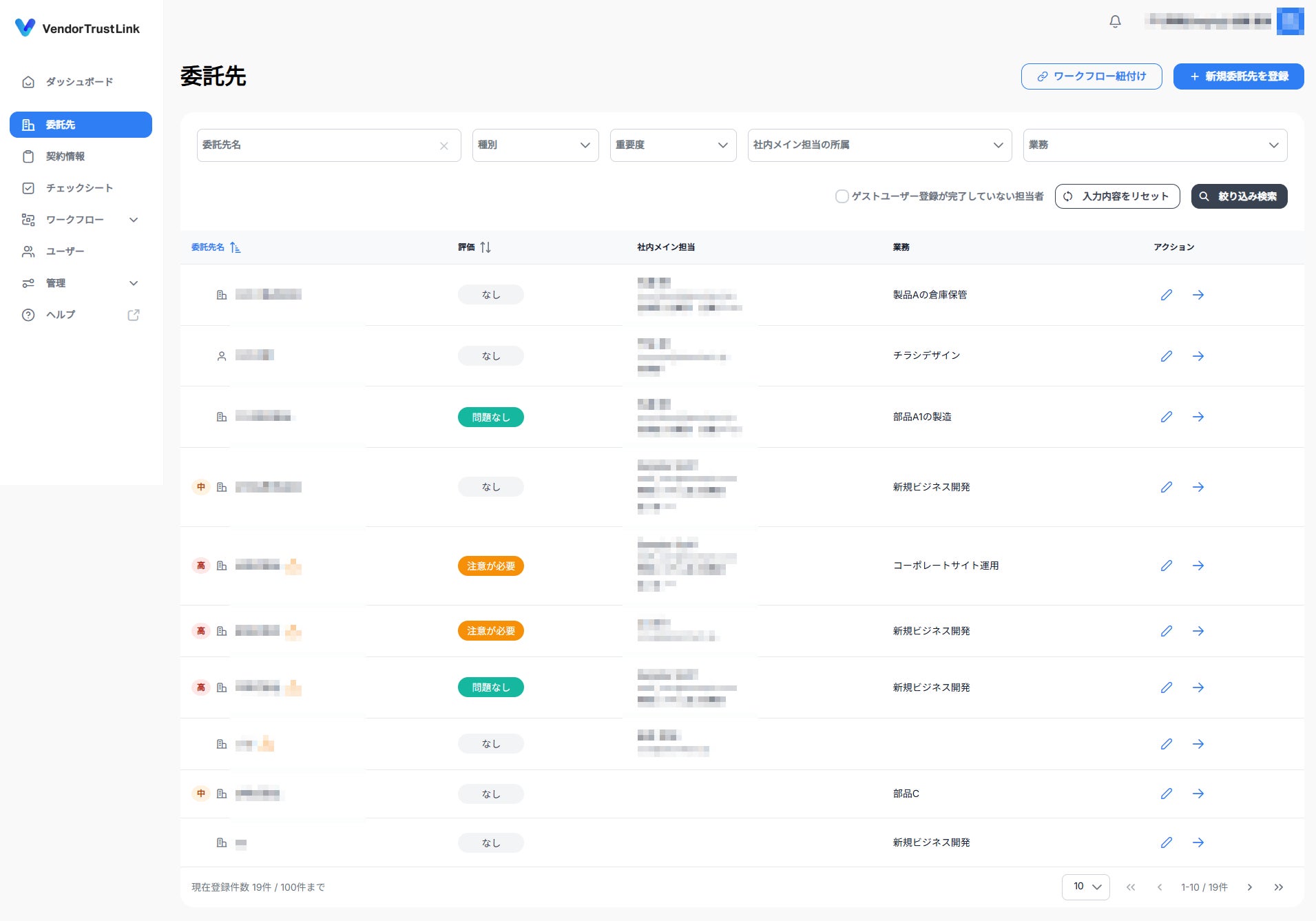 委託先一覧は自社にとっての重要度や自社内の担当部署、業務等により絞り込みが可能です。チェックシートの評価結果も紐づくため、委託先の比較もしやすくなります。