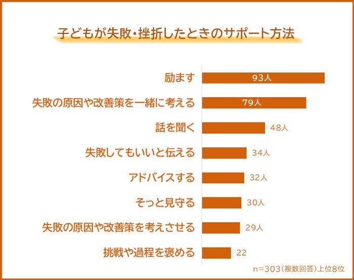 子どもが失敗・挫折したときのサポート方法として最も多かったのは「励ます(93人)」。2位「失敗の原因や改善策を一緒に考える(79人)」も多くの票を集めました。