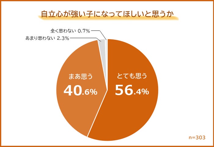小学生のお子さんがいる親御さん303人に「お子さんに、自立心が強い子になってほしいと思うか」と聞いたところ、「とても思う」「まあ思う」と答えた方が97.0%にのぼりました。ほとんどの人が「自立心の強い子に育ってほしい」と思っているとわかりました。