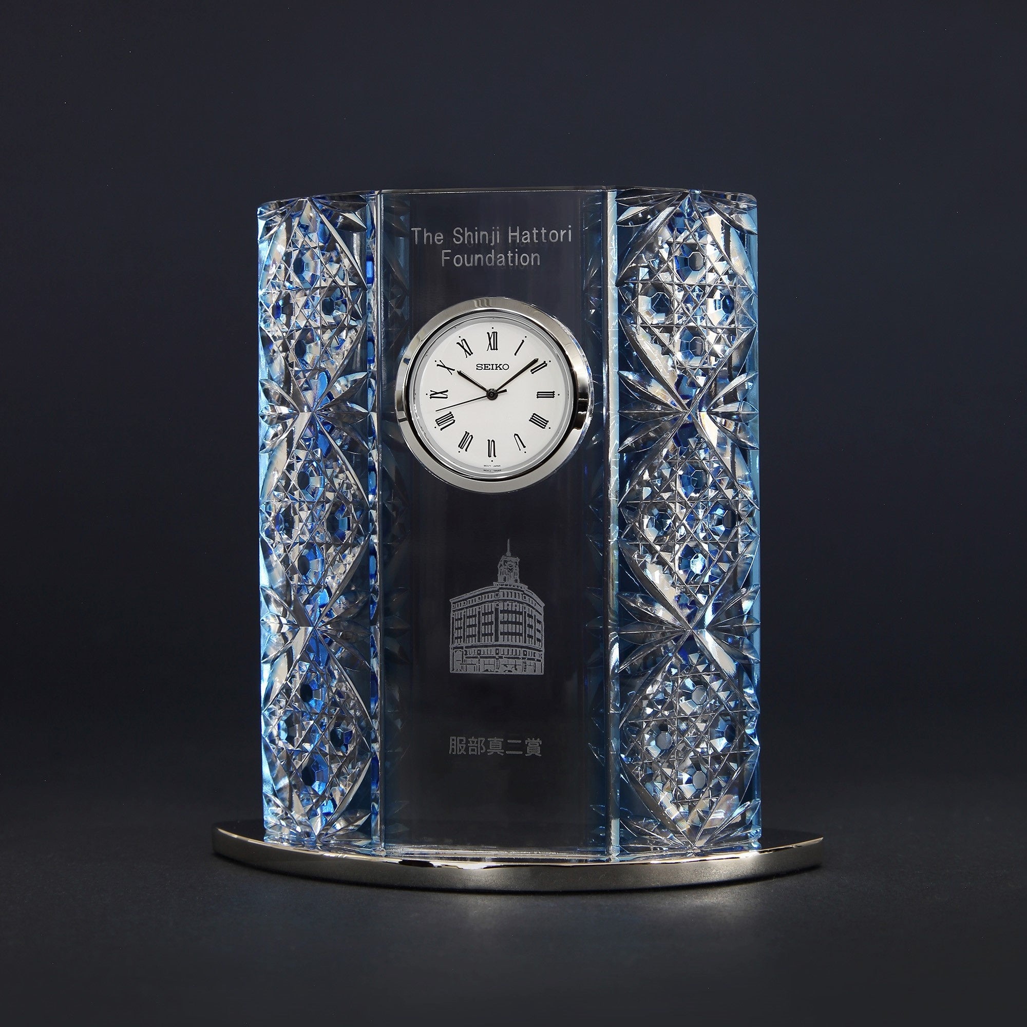 服部真二賞の受賞者に贈られるトロフィーは、受賞者の輝かしい未来を表現するために「江戸切子」と「クオーツ時計」とを組み合わせて作られています。