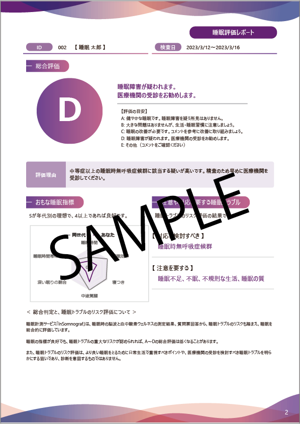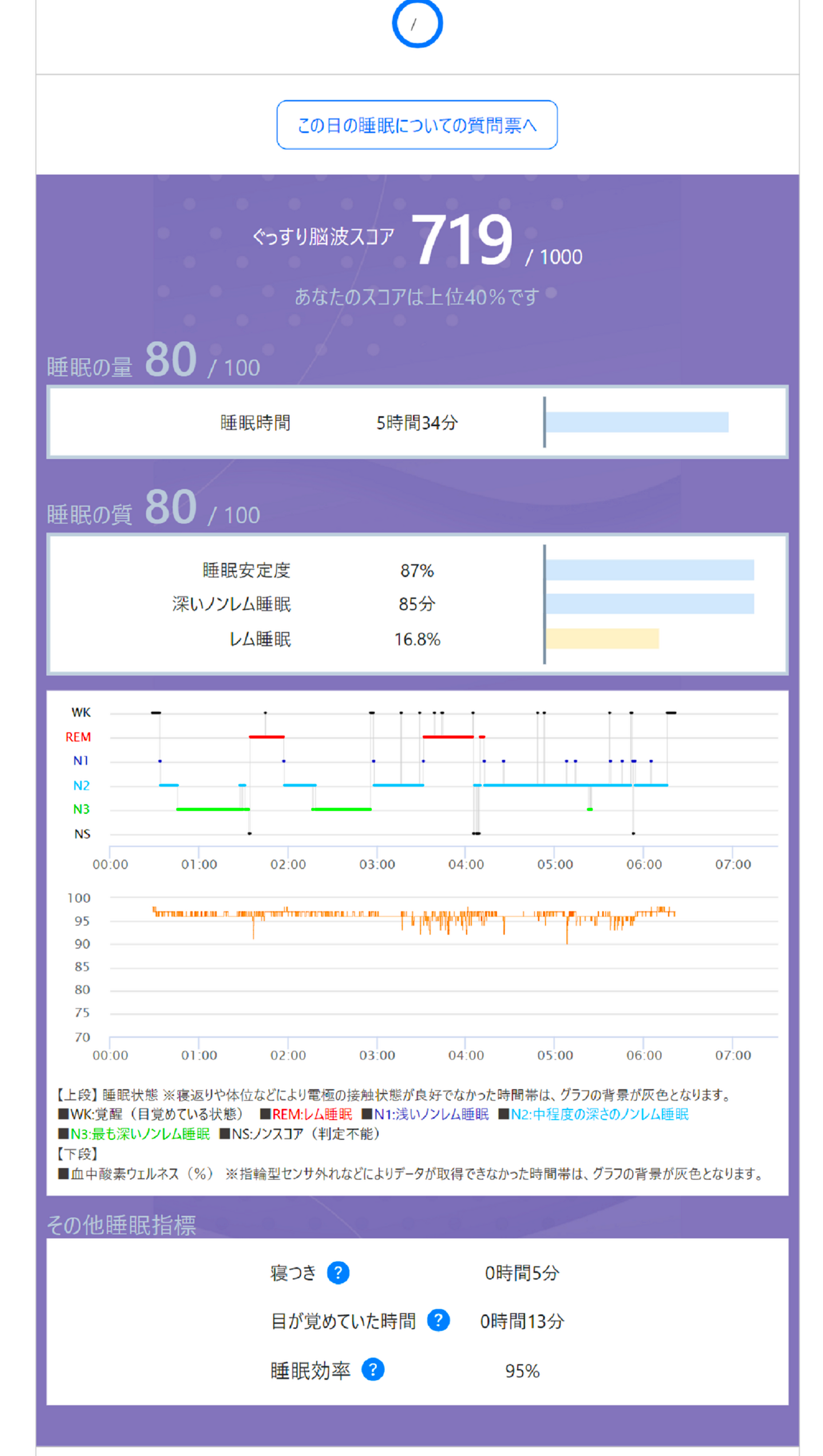 また、大がかりな検査入院を要する終夜睡眠ポリグラフ検査(PSG)に比べて汎用性が高く、日常環境での睡眠を計測できる特徴があります。