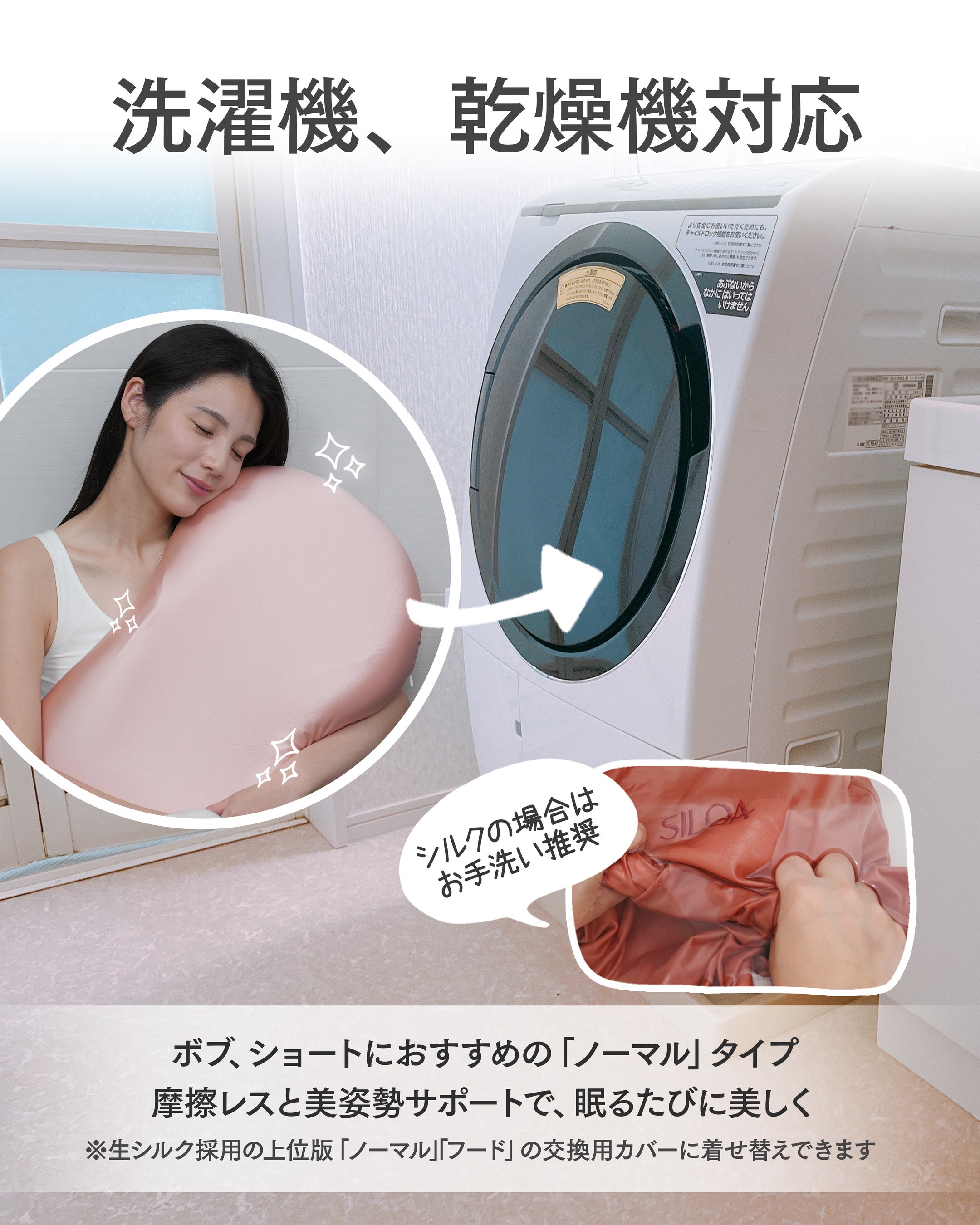 摩擦が少なく、髪や肌に優しい「シルクの枕カバー」を使った美容法が定着する一方、天然素材ゆえの「手洗い必須」「デリケートさ」が取り扱いのハードルとなっていました。 そこでSILQAは、「髪はキレイにしたい、でも手間はかけたくない」 そんな声に応えるため、1年の歳月をかけて洗濯機で丸洗いできる「人工シルク」を開発しました。