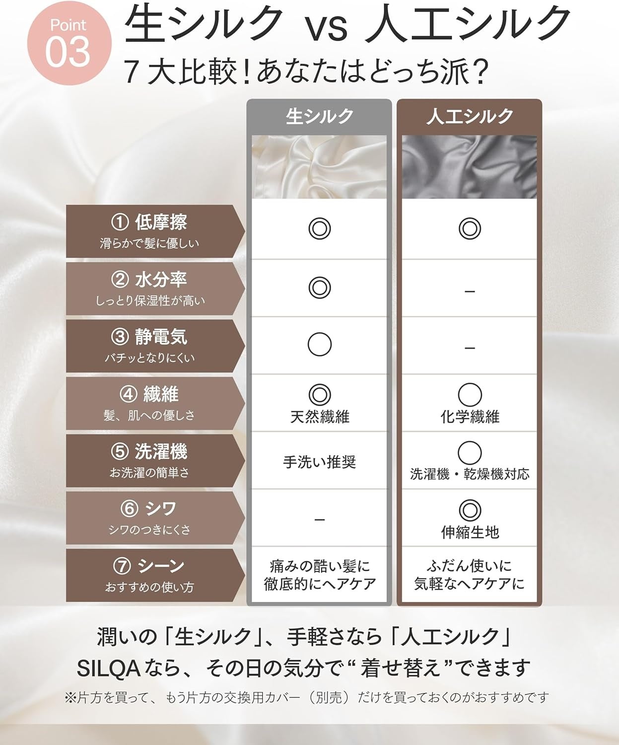 人工シルク(本製品): 「手軽さ」「低価格」「摩擦レス」を重視する手軽なケア派へ