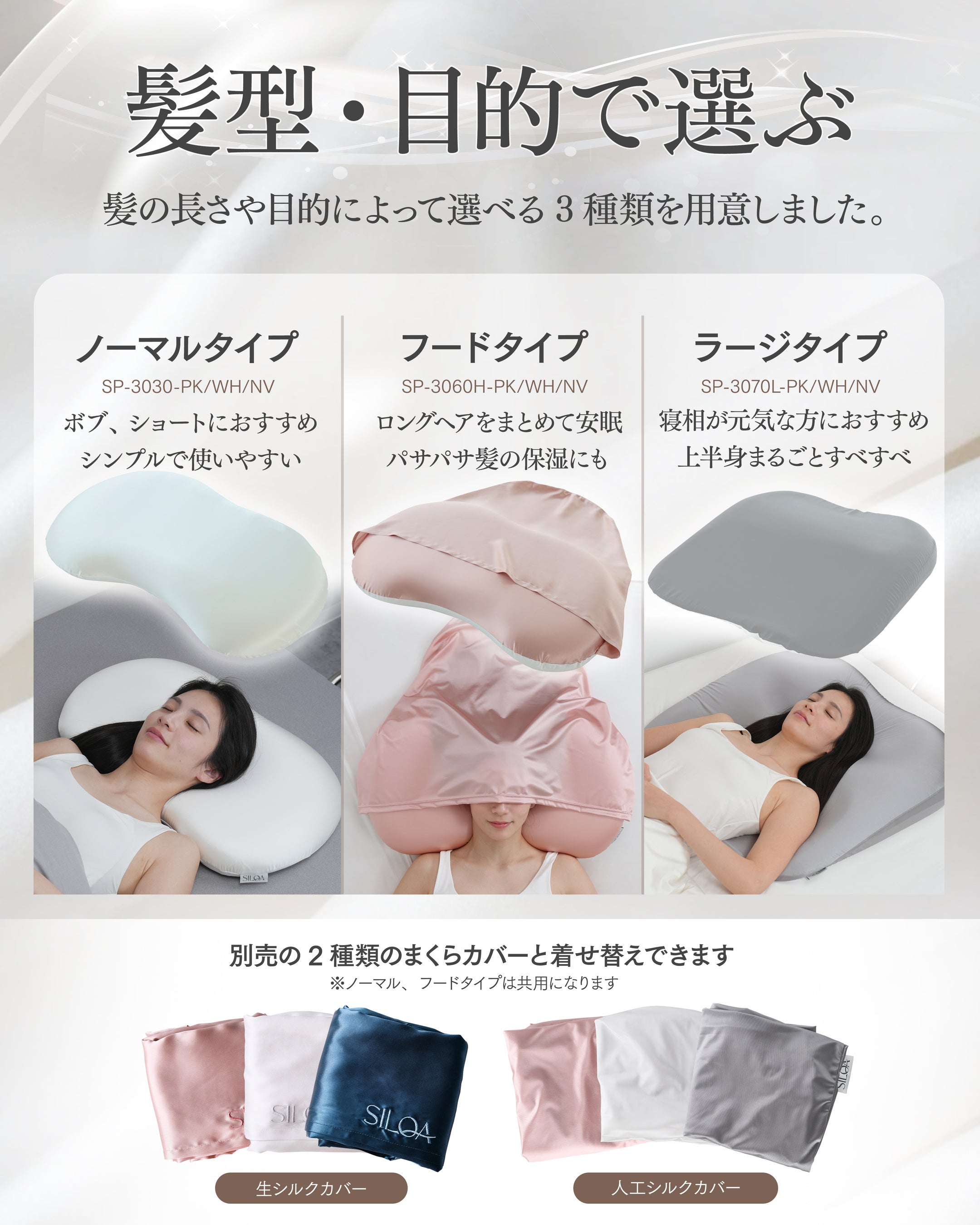 多様なニーズに応えるため、従来の枕の枠を超えたユニークな3タイプを展開します。先行して発売した天然シルク版の販売実績では、一般的な形状よりも「フードタイプ」等の独自機能を持つモデルが約8割選ばれており、枕に「悩み解決」を求める傾向が強まっています。