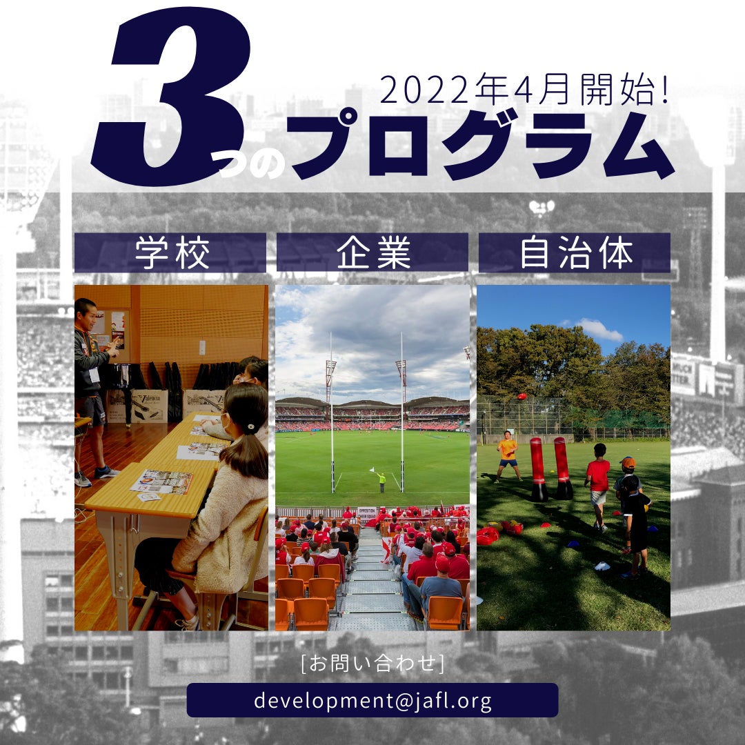 一般社団法人日本オーストラリアンフットボール協会(以下、AFL JAPAN)は2月25日(金)、学校、企業、自治体の皆様に向けてオーストラリアンフットボールを活用した3種類のプログラムを発表しました。