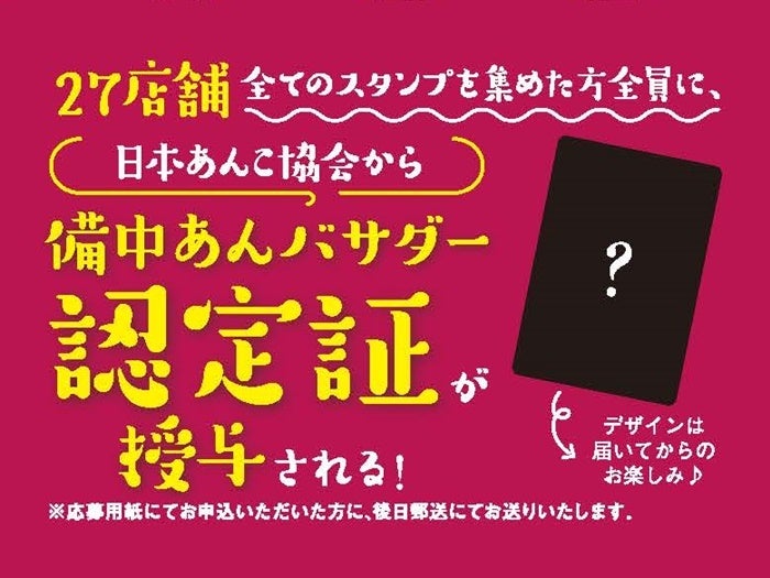 「備中あんバサダー」とは、あんこにまつわる基礎知識はもちろん、特に備中に特化したあんこ事情に精通した人物であることを認める称号です。弊協会から認定条件を満たしたあんこファンに対して授与される称号で、その証として、備中あんバサダー認定証が贈られます。認定条件は、この度の27の対象店舗すべてであんこスイーツを購入し完食することです。当スタンプラリーでは、あんこファンは食したあんこスイーツ毎に、「備中あんたび QankoA」というオリジナルあんこカードを手にすることができます。(※各店先着200名)カードには、あんこに関する基礎知識や備中に特化したあんこ事情を問う問題が書かれており、Q&A形式で学習することができます。カードはもちろん全部で27種です。つまり、27の対象店舗すべてをまわり、あんこスイーツを食べ切ったあんこファンは、それだけで備中に関するあんこマスターとなれるのです。