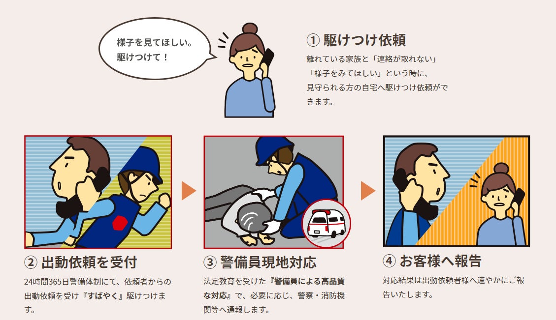 ご希望者には、お電話による依頼によって、見守られる方の住居まで警備員が駆けつけるサービスを、東急セキュリティ株式会社よりご提供いたします。