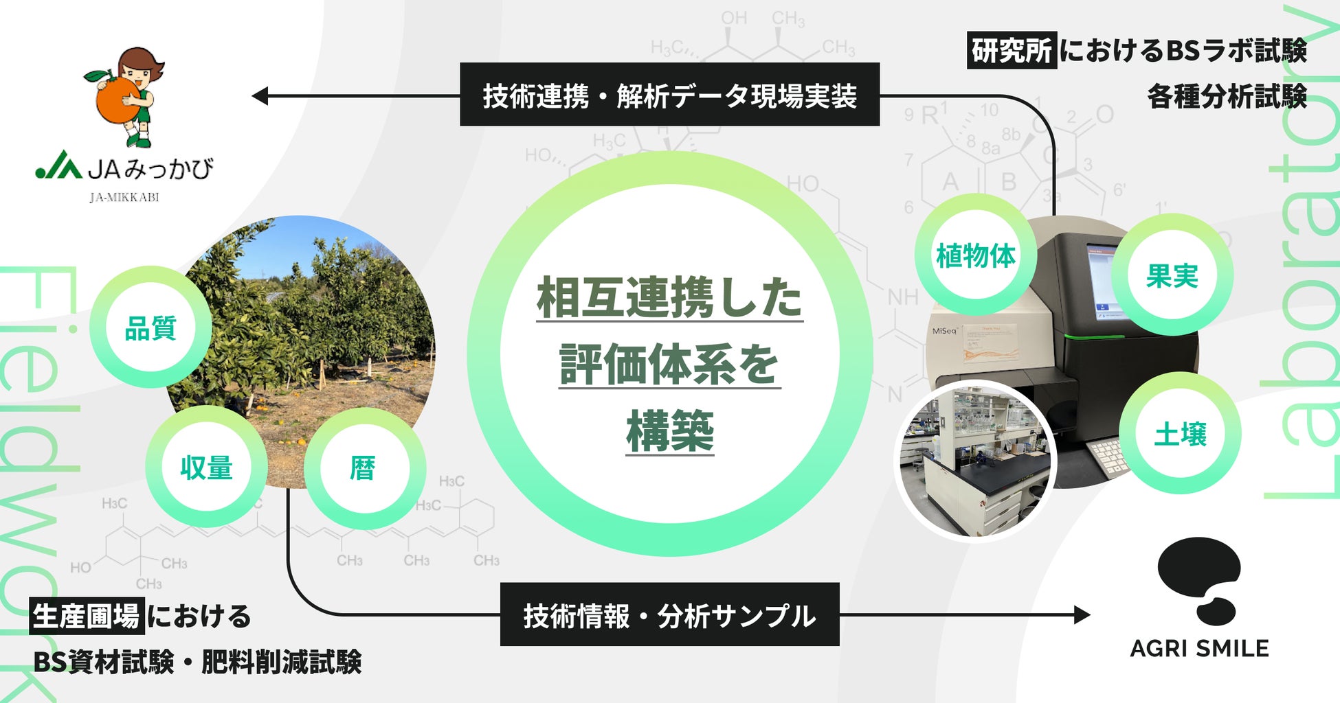 そこでAGRI SMILEでは、研究室レベルのエビデンス獲得と圃場レベルでの現場実証を両輪で回す仕組みを構築すべく、まずは自社研究室にて複数の資材を対象に評価を開始し、有効性を確認しました(未発表データ)。今回の共同実証試験では、研究室レベルで得られた知見を基に、圃場レベルでの多面的な分析によるBS資材評価体系の構築を目指します。本取り組みは浜松市ファンドサポート事業費交付金による支援の下、JAみっかびと共同で温州みかんの生産圃場において2年間実施いたします。