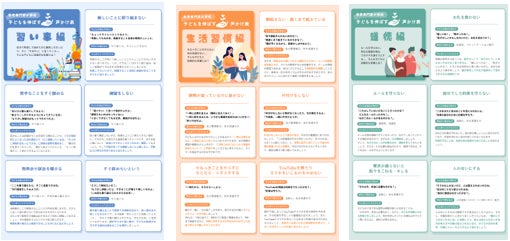 習い事編」「生活習慣編」「道徳編」「勉強・塾編」 といった、日常生活の4つのカテゴリーごとに、あるあるシーンで使える1~3種類の声かけフレーズが書かれています。記載されているシーンは、子どもの才能を伸ばすチャンスのある場面でもあります。具体的なフレーズが書かれているので、すぐに生活に取り入れることができます。