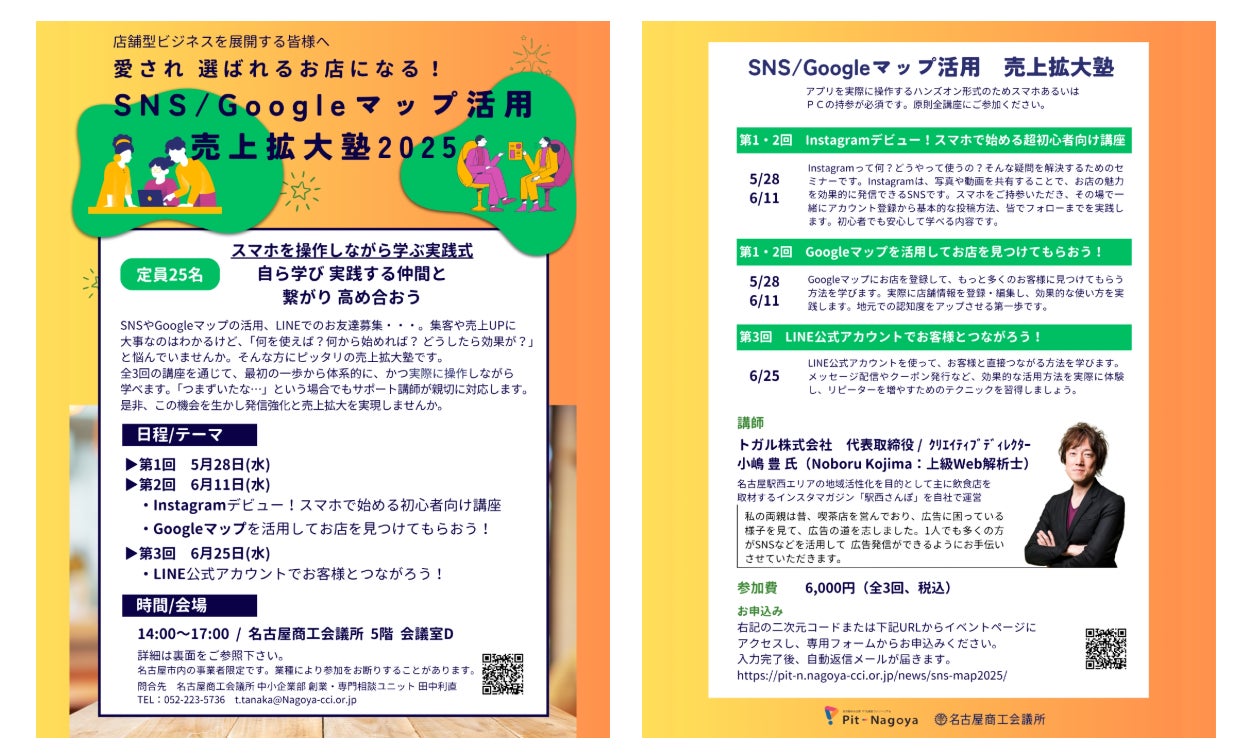 トガル株式会社(本社:名古屋市中村区、代表取締役:小嶋豊)は、名古屋商工会議所が主催事務局を務める名古屋中小企業IT化推進コンソーシアム(Pit-Nagoya)が主催する店舗型ビジネス向けデジタルセミナー「SNS/Googleマップ活用 売上拡大塾2025」の講師として、昨年に続き地域事業者の皆様へのデジタルマーケティング支援を6月25日まで実施いたしましたことをお知らせいたします。