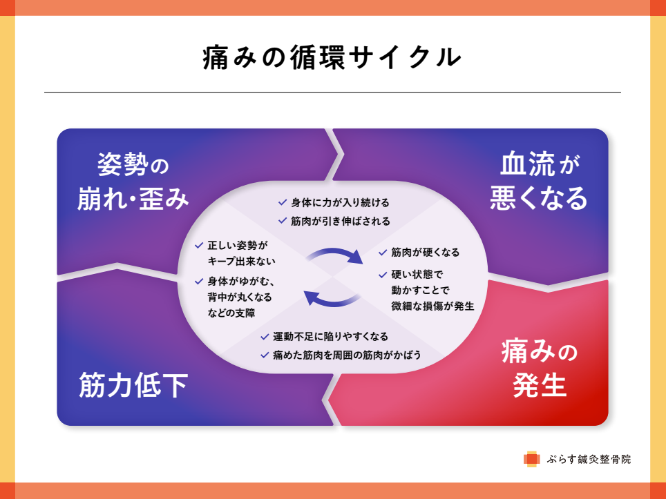 筋肉の凝りや痛みが発生してしまう原因は姿勢の崩れや歪みです。姿勢が崩れてしまうと、筋肉の緊張やこわばりに繋がり血流が悪くなり、血流が悪くなると筋肉は硬くなります。筋肉が硬いまま身体を動かすことで筋肉の損傷に繋がり痛みが発生し、痛みが発生すると人はその箇所をかばう姿勢を取ったり、筋肉も損傷した筋肉周辺をかばったりすることで筋力低下に繋がります。筋力が低下するとまた正しい姿勢をキープできないことに繋がり、最終的に身体の歪みとなります。これが痛みのサイクルの構造です。痛みを引き起こさない身体にしていくためには「姿勢改善」が不可欠なのです。