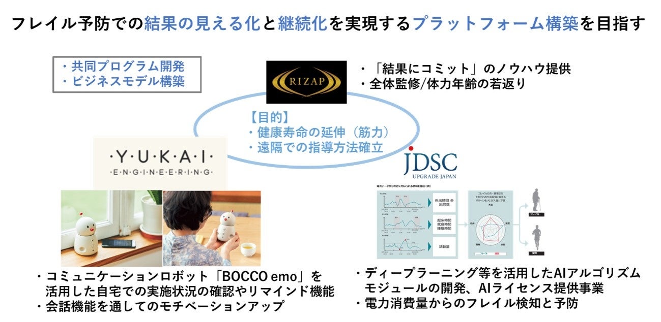 株式会社JDSC(代表取締役社長 加藤エルテス聡志、本社:東京都文京区)は、RIZAP株式会社(代表取締役社長 瀬戸 健、本社:東京都新宿区)、ユカイ工学株式会社(代表取締役 青木俊介、本社:東京都新宿区)と3社合同で、健康寿命延伸サービスの構築と検証を開始したことをお知らせいたします。