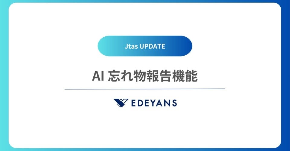 株式会社Edeyans(東京本社:東京都中央区、大阪本社:大阪市中央区、代表取締役:片山 裕之、以下「Edeyans」)は、客室清掃DXプラットフォーム 「Jtas-ジェイタス-」(以下、「Jtas」)において、写真を撮影するだけで忘れ物に関する情報を自動入力できる「AI忘れ物報告機能」の提供を開始いたしました。