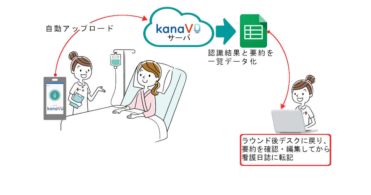 kanaVoは、診察中の会話をカルテ化するツールです。これを支えている技術は、文字起こしをする「音声認識」、文字起こし結果をカルテ形式に要約する「AI」であり、「深層学習」により賢くなり続けていきます。