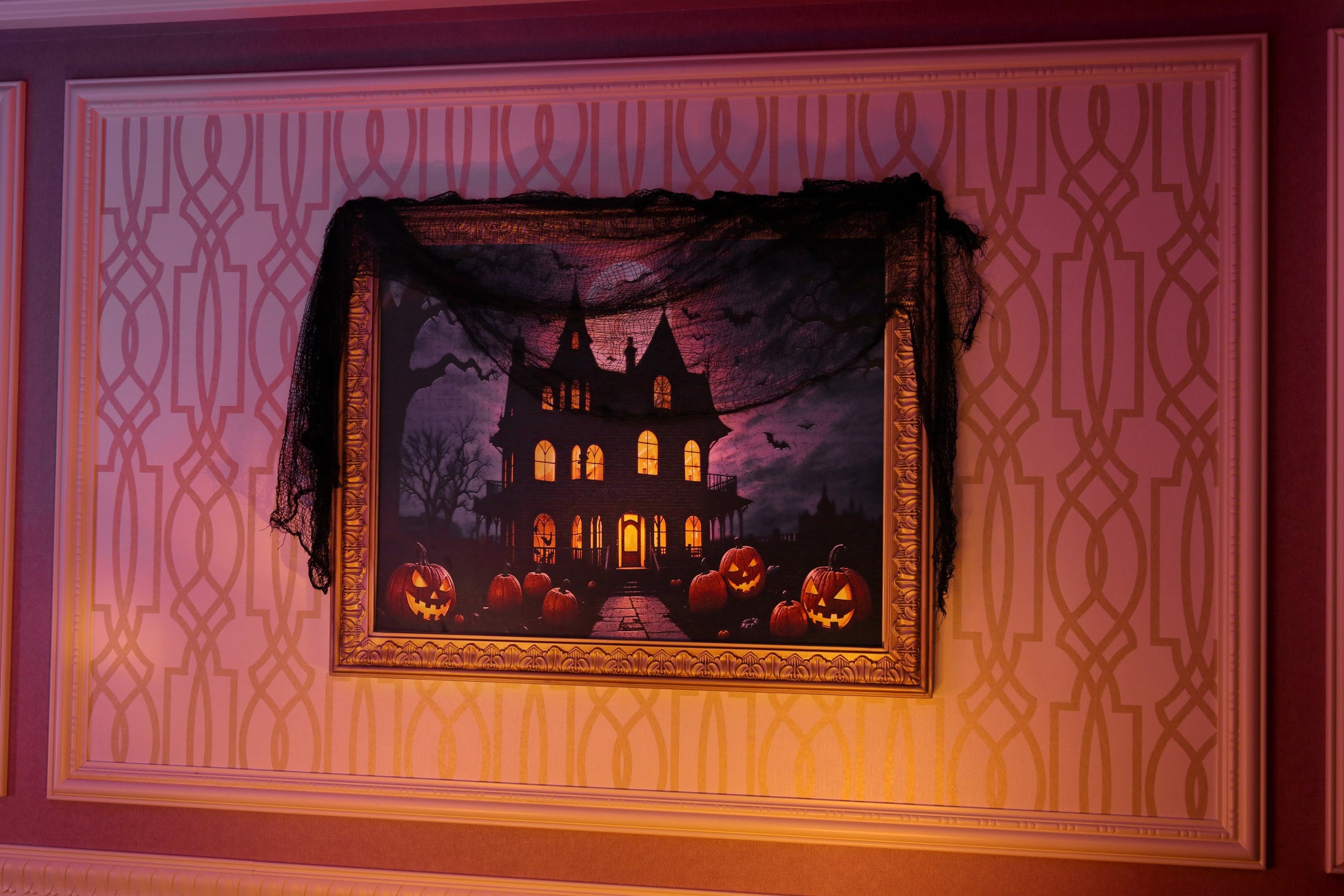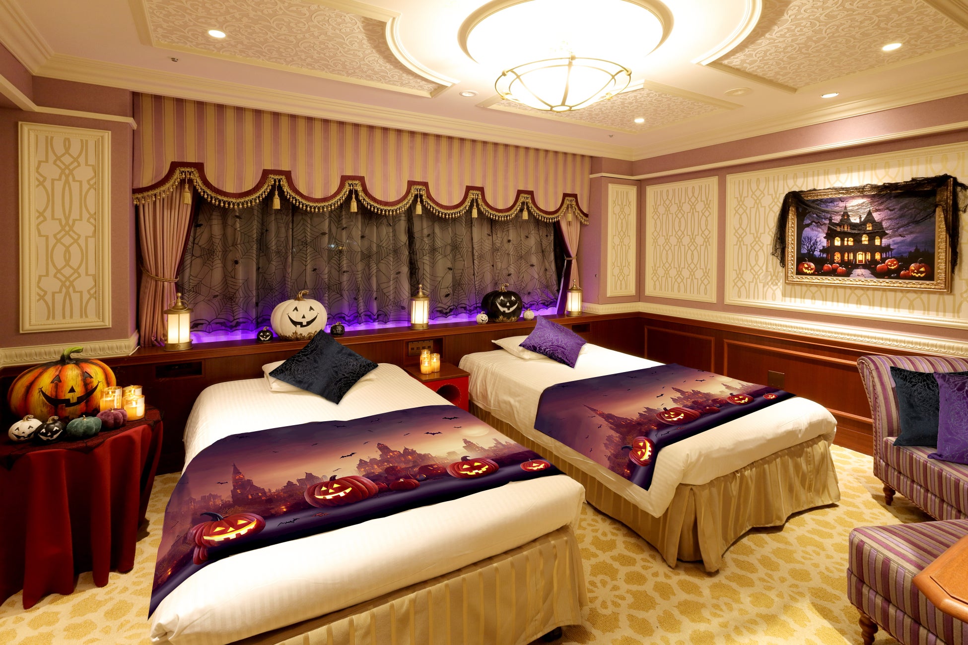 「お城のサロン」をイメージしたインテリアデザインの客室に、ハロウィーンのデコレーションをいたします。