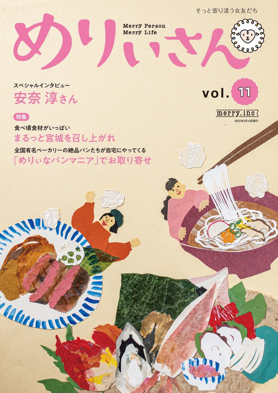 各ジャンルのプロフェッショナルや著名人を招き、生き方、暮らし方、健康、食にまつわる情報を発信します。vol.11では、歌手として活躍、現在はファッションセンスが注目されている安奈 淳さんのスペシャルインタビューや、「めりぃさんのお店」で販売中のお取り寄せ食材を使ったレシピを紹介。