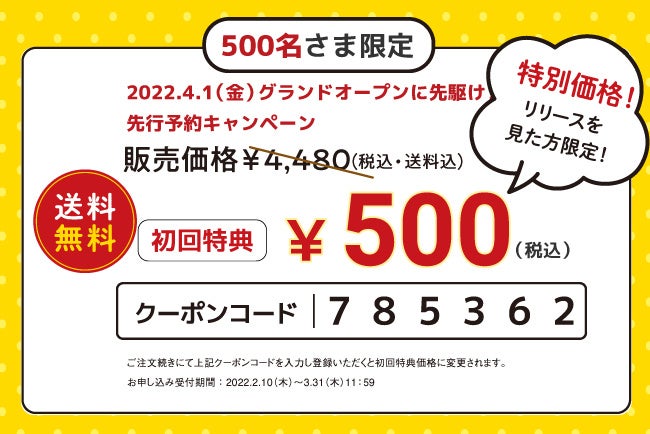 ②ご注文手続きにて以下クーポンコードを入力し、登録いただくと初回特典価格に変更されます。