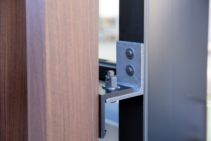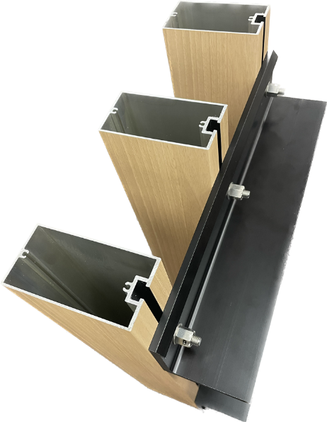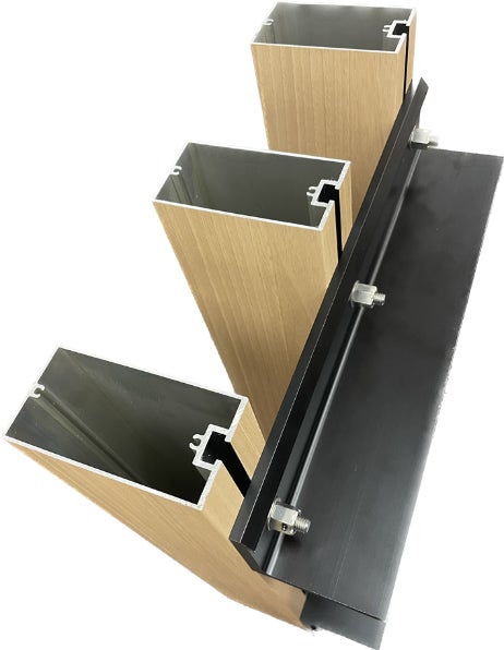 カーテンウォール前面にルーバーを設置します。接合性向上のためボルトポケット方式のアルミ断面に緩み止めナットにて締結する方式を採用しました。