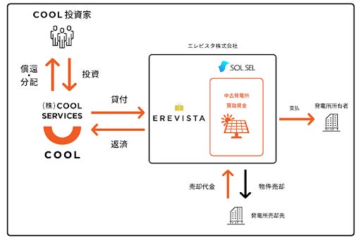 お客様より投資いただいた当ファンドの資金は、同じくZUUグループに属する貸金業者である株式会社COOL SERVICES(東京都世田谷区:代表取締役 伊藤 謙)からエレビスタに対して貸し付けられ、エレビスタが手掛けるSOLSEL事業において中古太陽光発電所の仕入資金の一部として使用されます。