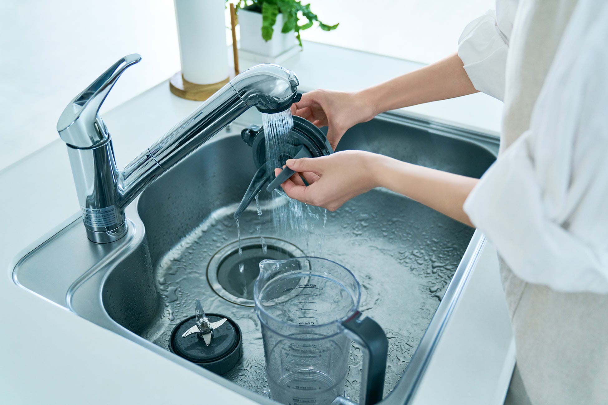 パーツが分けられて洗いやすく、本体以外のピッチャー、フタ、ブレードユニットは食器洗い機対応でお手入れが楽です。また、洗剤と水をかくはんして簡単に洗浄でき、いつでも清潔に保つことができます。