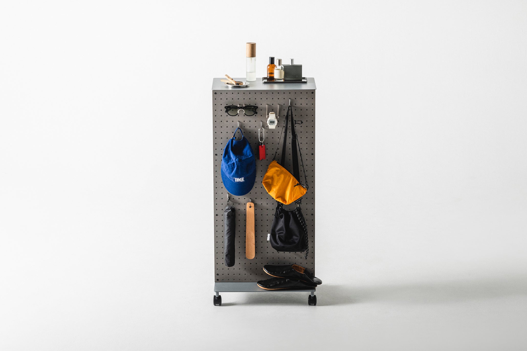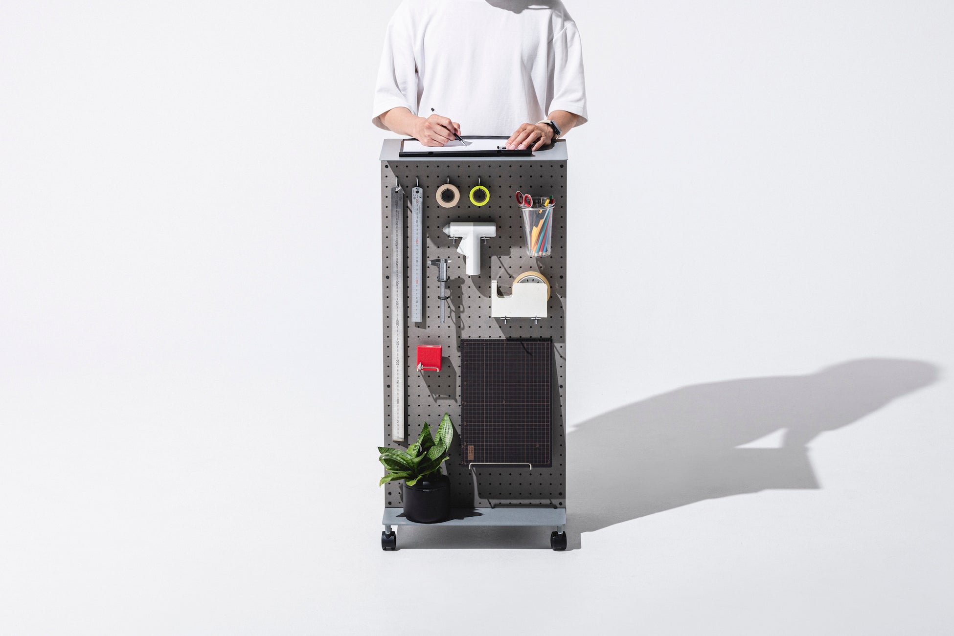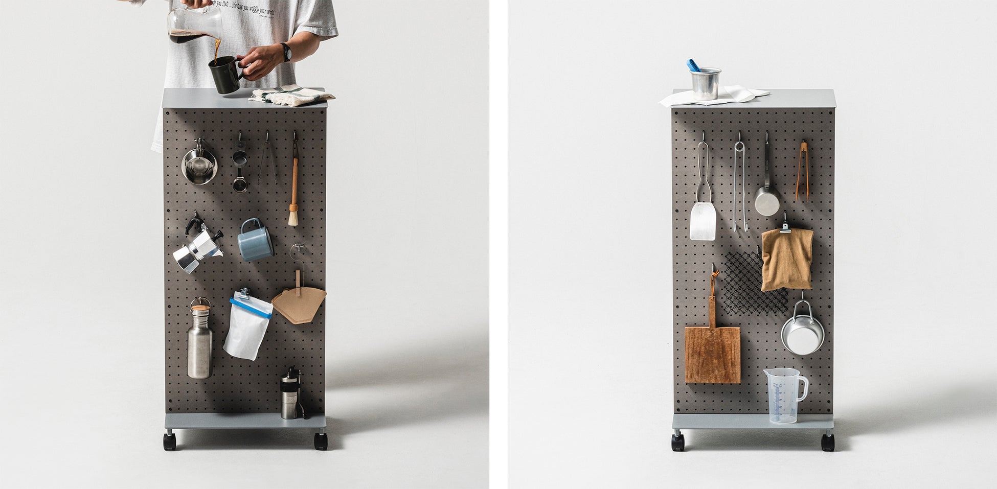 底面のキャスターによって気軽に設置場所を移動でき、両面の有孔ボードによって多種多様な道具を収納できる構造になっています。