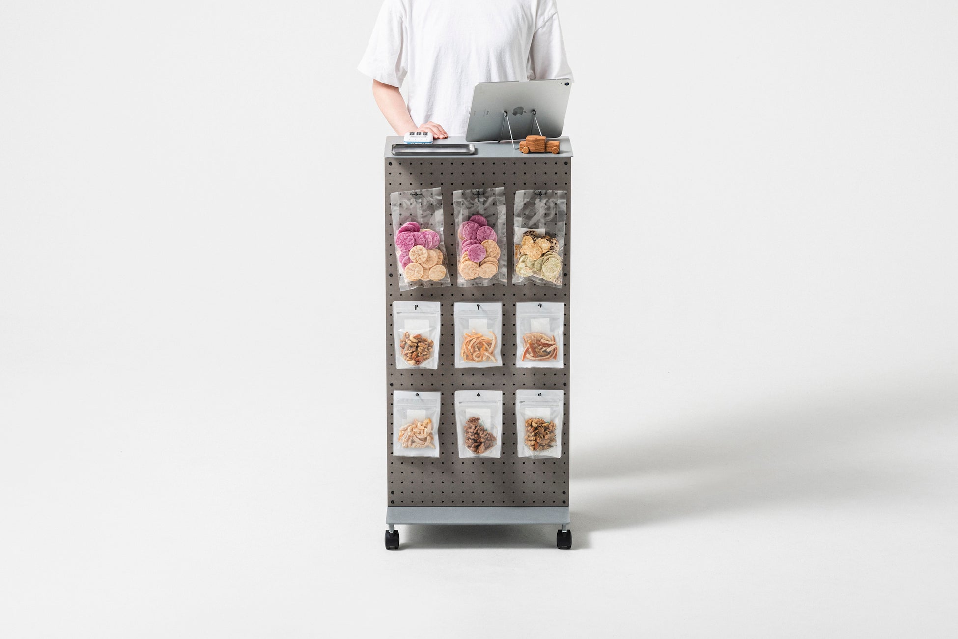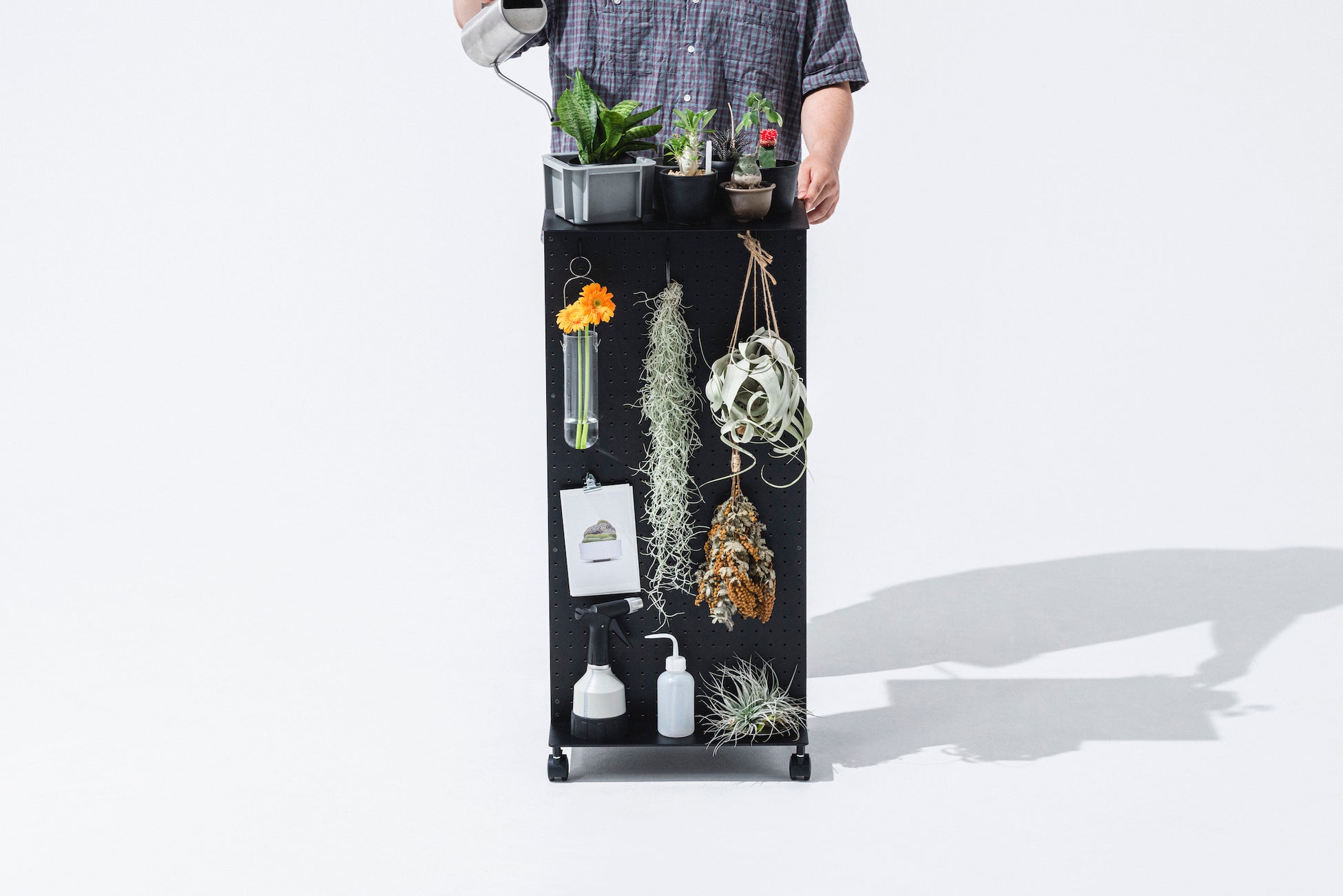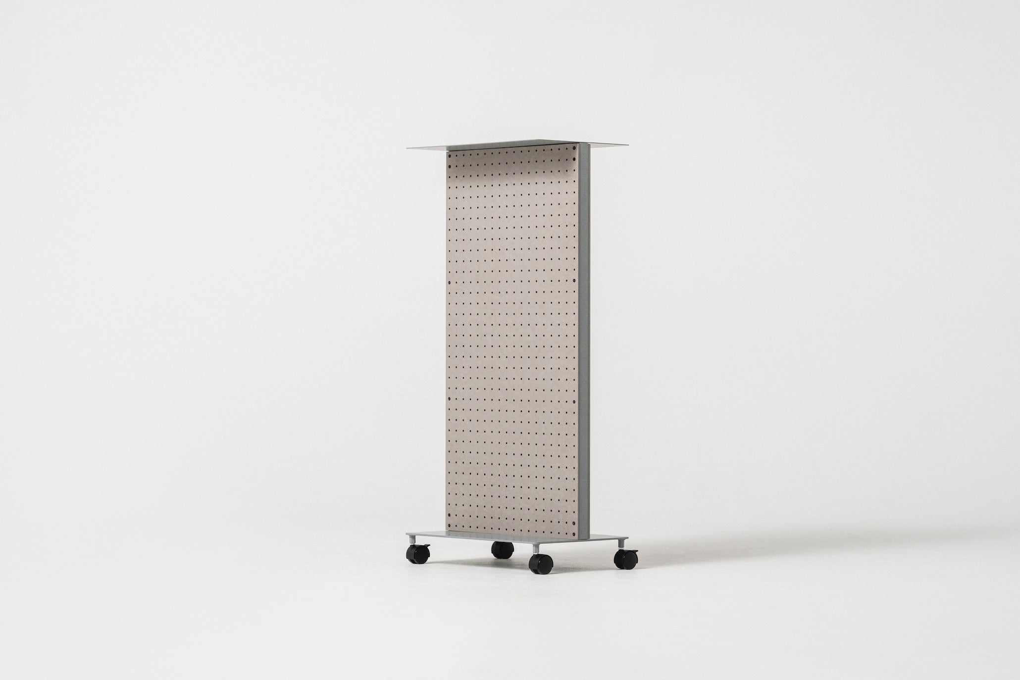 底面のキャスターによって気軽に設置場所を移動でき、両面の有孔ボードによって多種多様な道具を収納できる構造になっています。