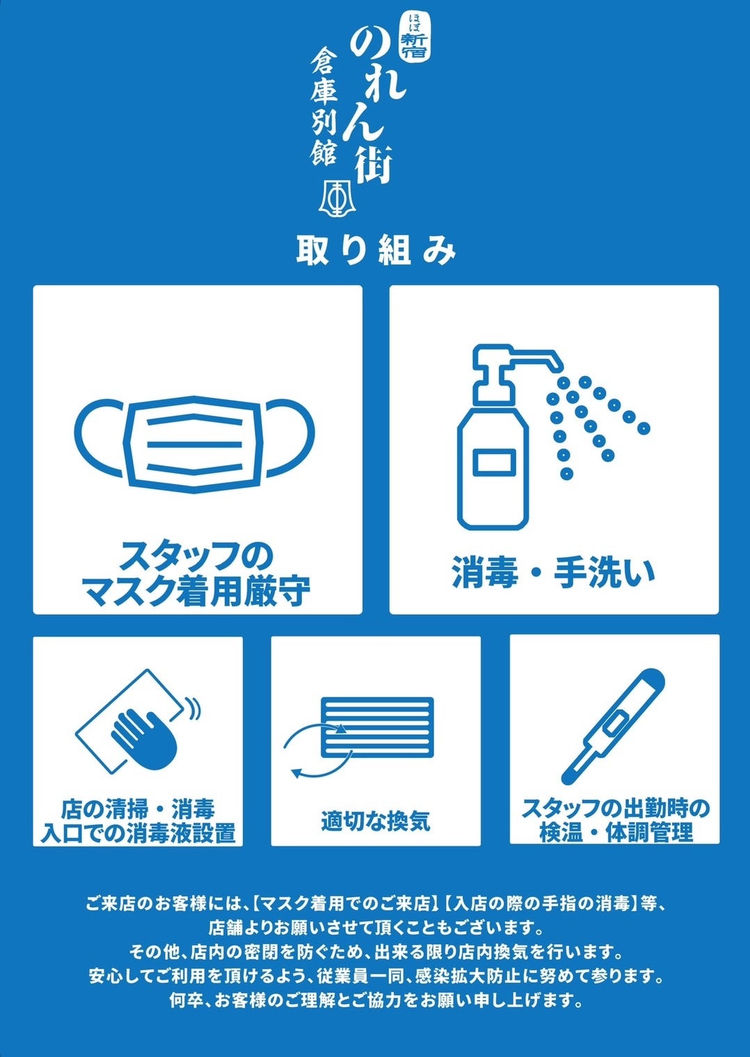 ご来店のお客様には、「マスク着用でのご来店」「入店の際の手指の消毒」等、店舗よりお願いさせて頂くこともございます。その他、店内の密閉を防ぐため、出来る限り店内換気を行います。安心してご利用頂けるよう従業員一同、感染拡大防止に努めて参ります。何卒、お客様のご理解とご協力をお願い申し上げます。