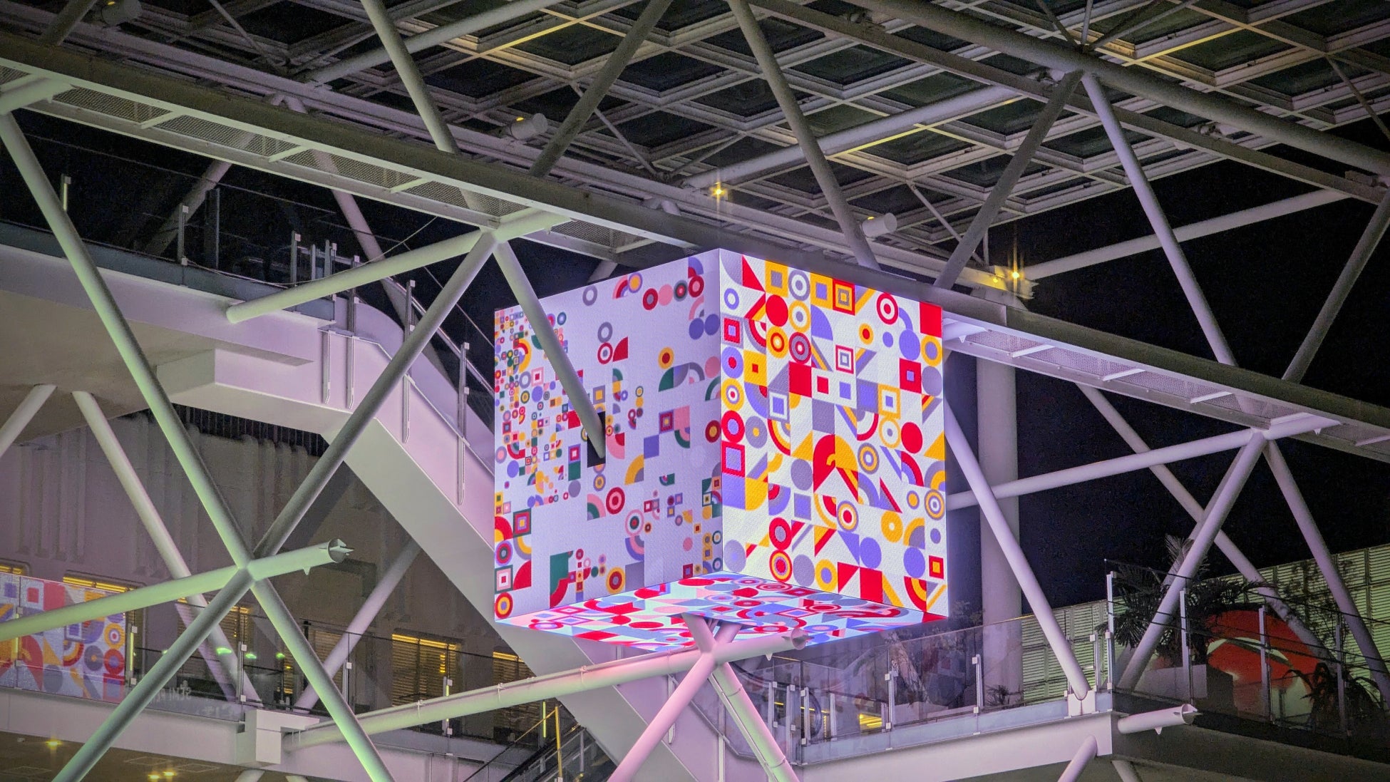 玉川髙島屋S・Cのファサードリニューアルに伴い、最大6メートル四方の大型LEDキューブ3台を設置。高尾俊介氏による新作「光を刻む」を展開。NEORTがアートキュレーション・システム設計を担当。