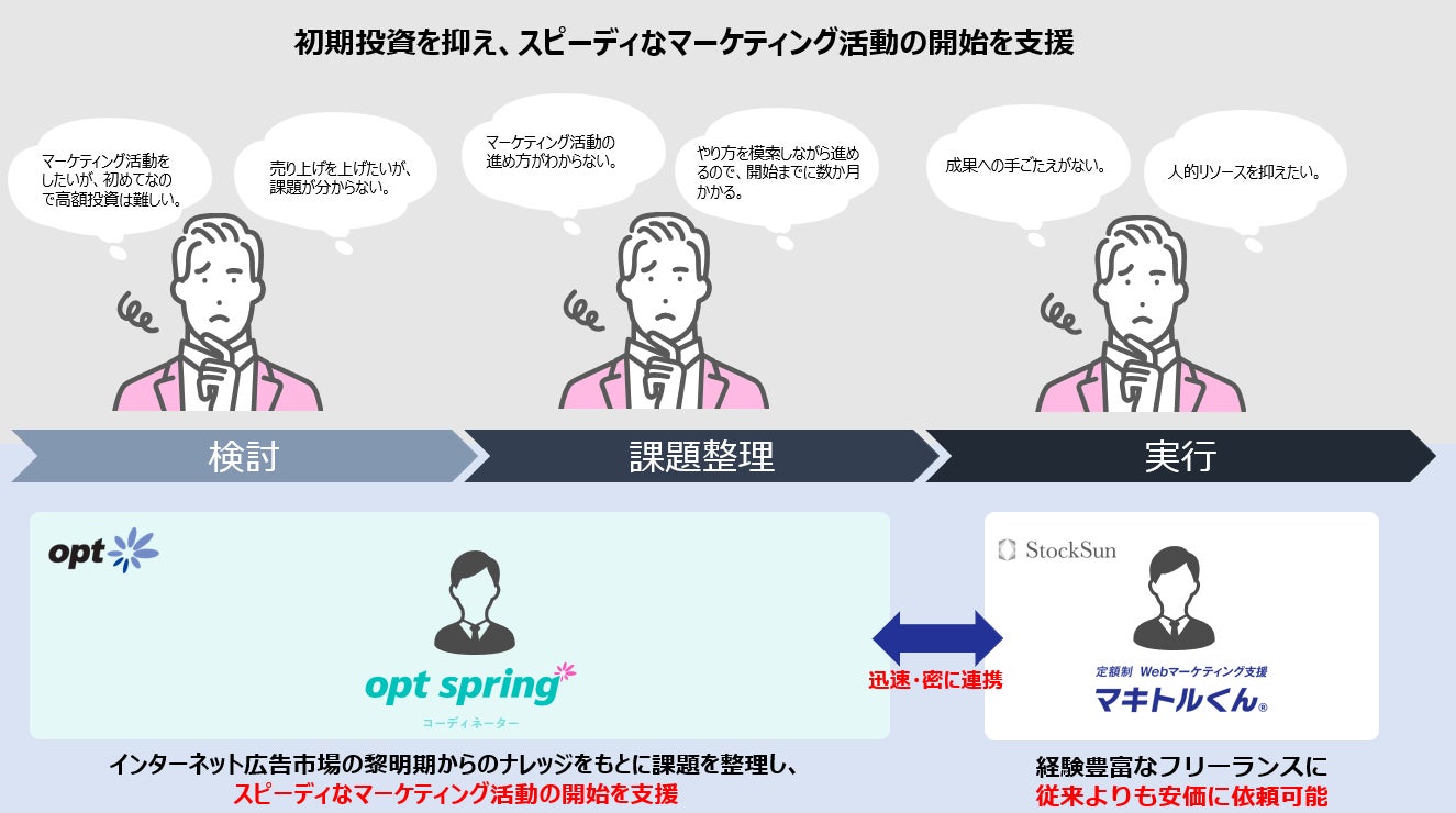 StockSunが提供するWebマーケティング実行支援サービス「マキトルくん」と、オプトが提供するオプトコミュニティを活かして顧客企業の事業成長を支援するマーケティングサービス「opt springⓇ」の一部サービスを連携し、クライアント企業に対して、より効果的で包括的なデジタルマーケティングソリューションを提供します。