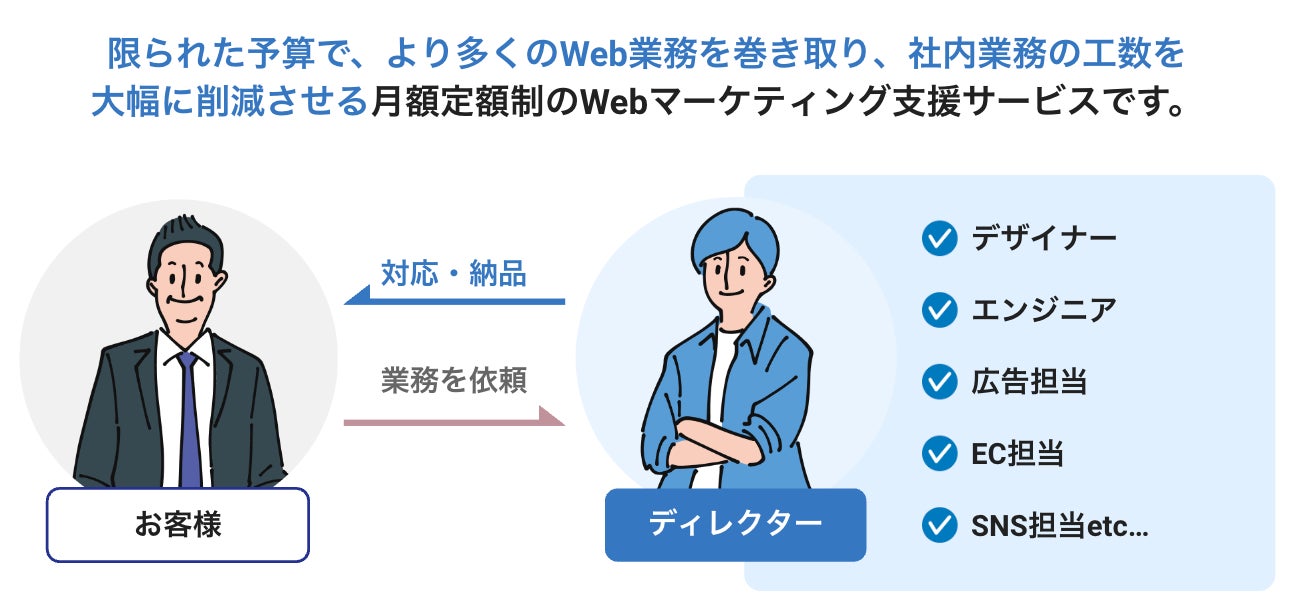 月額5万円からサイト運用保守、Web制作、Web広告運用、SEO、SNS運用などのWeb業務を幅広くご依頼いただくことができます。