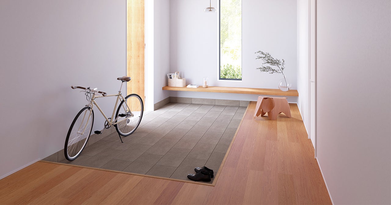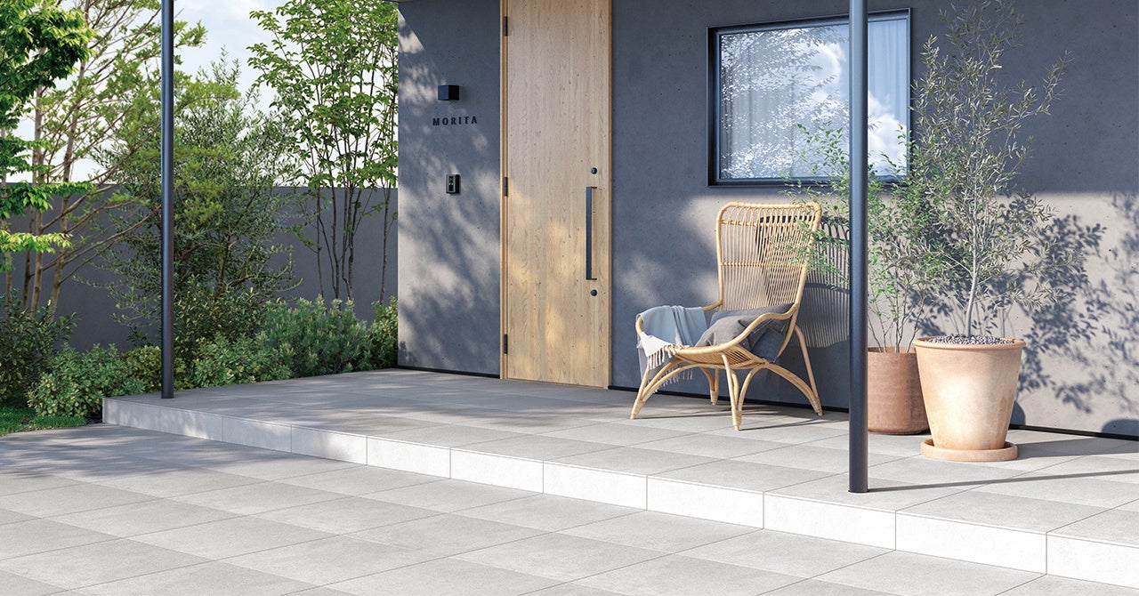 カラーは三色で展開。どの色も彩度を下げた色合いとすることで、地面との類似性を感じさせてくれます。日本住宅で使われることが多い300角ではなく、600角・600×300角とし、タイルを大判化させることで空間に広がりを演出します。カラー