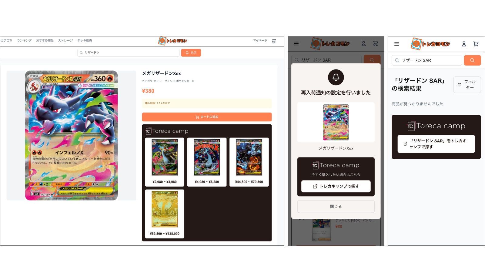 本提携により、「トレカコモン」で検索した商品が取扱範囲外や欠品の際に「トレカキャンプ」への導線が表示され、カードをお求めのお客様が「トレカキャンプ」へシームレスに移行いただくことが可能となります。カードを探し直す手間を軽減し、お客様がより手軽に目的のカードへ到達できる導線を提供します。