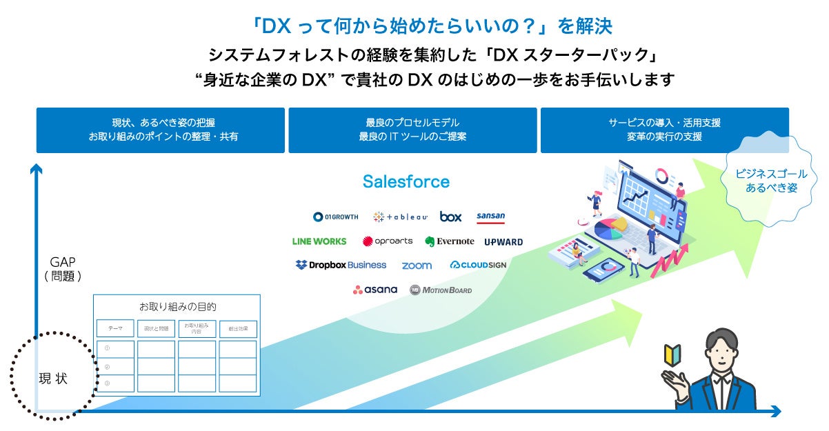 システムフォレストは、DXスターターパックを通じた支援の中で、みなさまのビジネスゴールと現状を踏まえ、ITの活用を通じて社内の様々な変革の一助となるべく、自社の成功・失敗の経験も交えながら、みなさまと一緒に変革を進めてまいります。