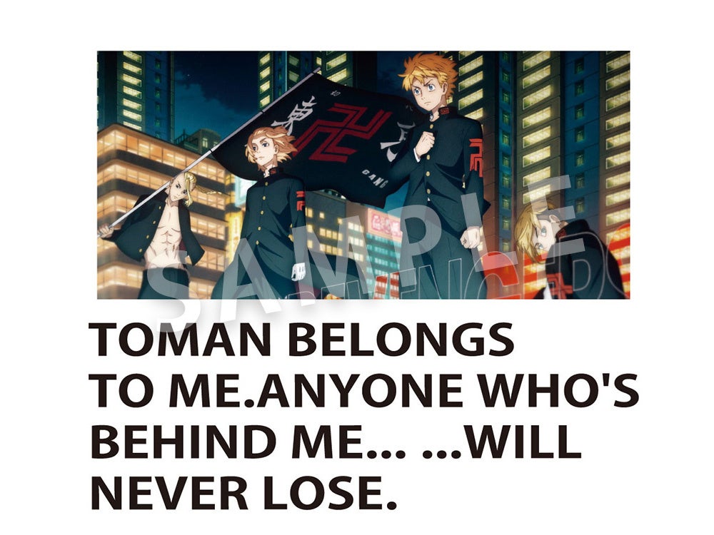 人気キャラクターと作中のセリフをバックにプリントしたアイテム。前面には東京リベンジャーズのロゴ。