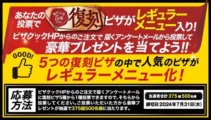 ピザクックHPからのご注文で届くアンケートメールで「5種の復刻ピザ」人気投票に投票いただいた方から抽選で375組500名に当たる豪華プレゼント実施中!