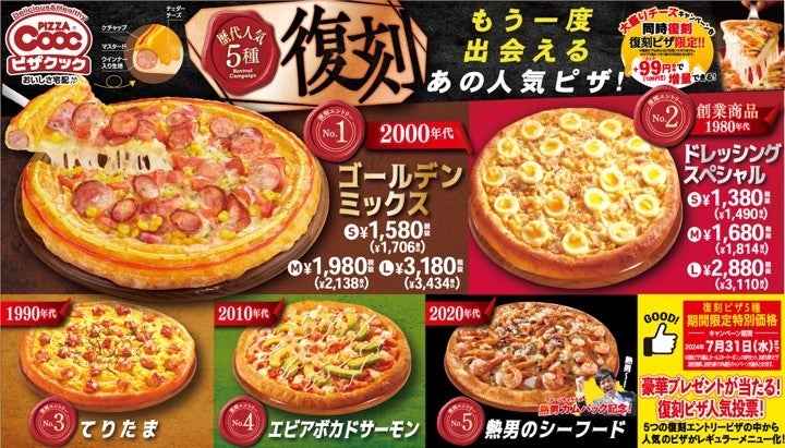 ピザクック(運営元:イワタダイナース 福岡市博多区諸岡3-25-20)が創業した1980年代から2020年代まで、各年代を彩った人気ピザ5種が復刻!(キャンペーン期間:2024年5月7日~7月31日)
