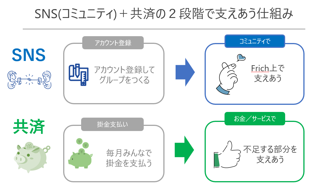 Frich (フリッチ)株式会社は、支えあいに特化した共済コミュニティSNS(P2P互助プラットフォーム)を提供しています。