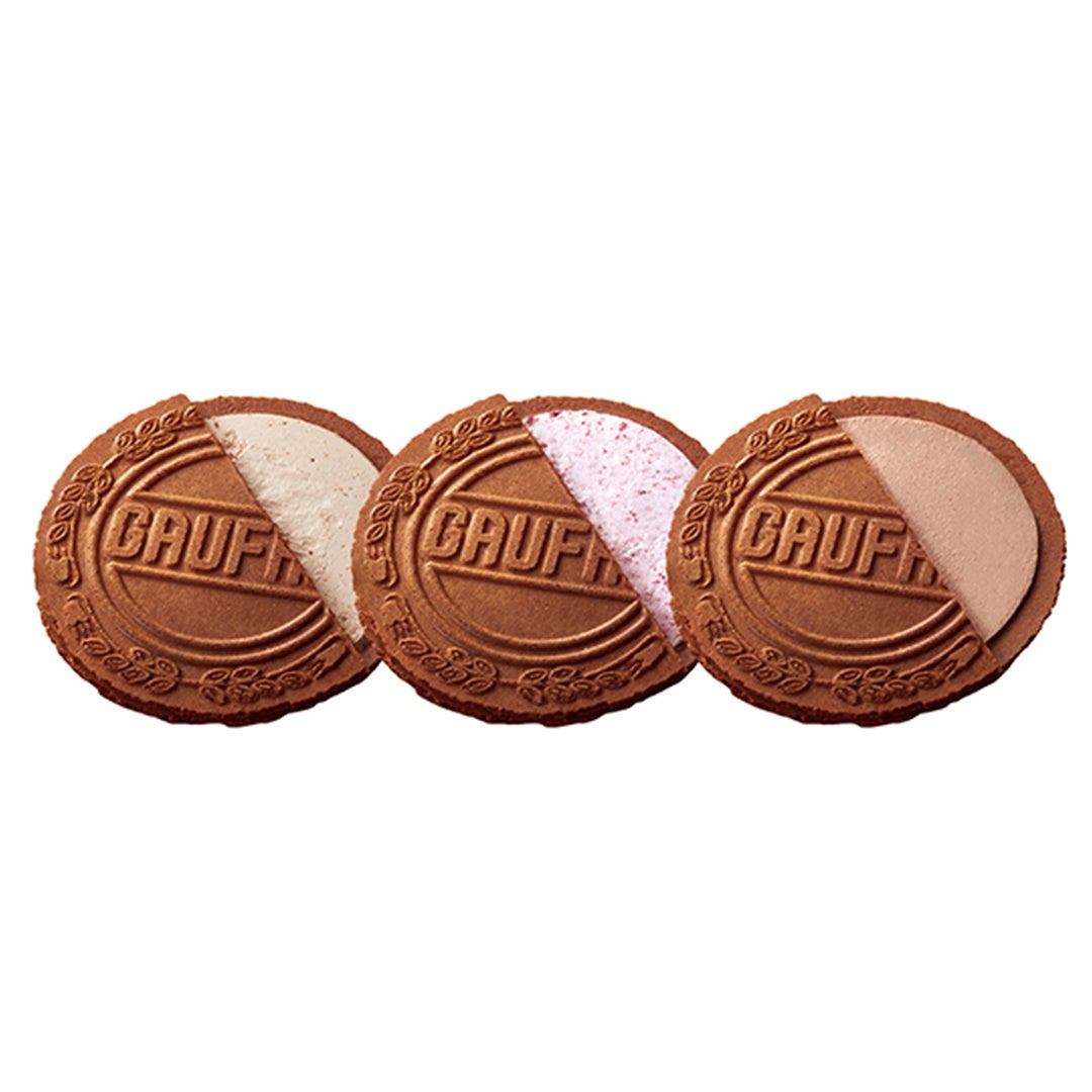 商品特長:ショコラ味に焼き上げたウエハースに、チョコレートクリームやヘーゼルナッツクリーム、ラズベリークリームをサンドして仕上げました。ちょっと大人で洗練された、これまでにないプティゴーフルです。