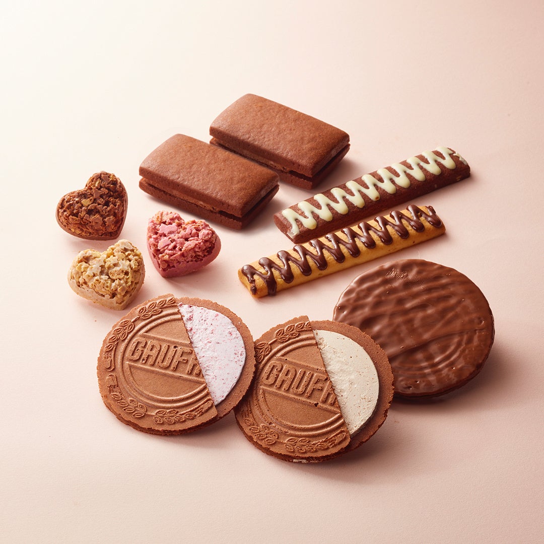 商品特長:2020年バレンタイン初登場し好評を博した「プティゴーフル ショコラライン」と、人気No.1の「ショコラゴーフル」をセットにした、ゴーフルファン垂涎の贅沢なセットです。