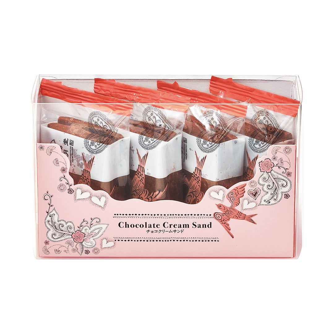 商品特長:サクッと香ばしく焼き上げたチョコクッキーで、チョコレートチップ入りのチョコレートクリームをはさんだ、チョコレート尽くしの美味しさです。