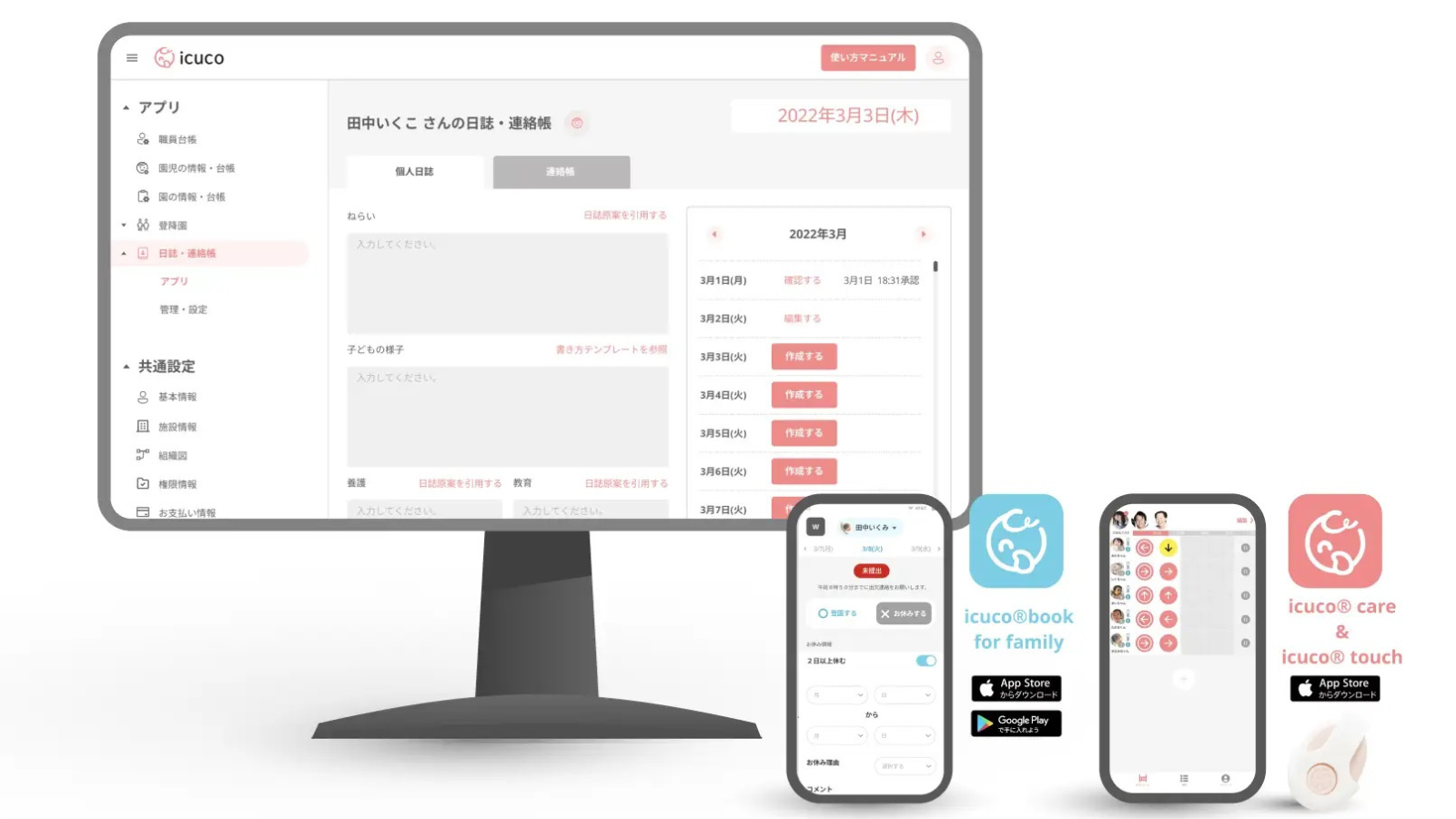 icucoは園管理システム「icuco®book」のほかに、現在リリースしている午睡チェックセンサー「icuco®touch&care」、置き去り防止装置「icuco®eyes」を合わせた3つのサービスで、今後も人の目を補うサービスを提供し、保育や福祉の現場での業務負荷と心的負担の軽減につなげていきます。