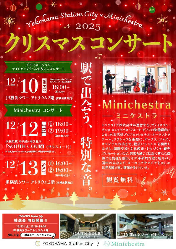 ミニケストラ株式会社(本社:東京都港区、代表取締役社長:小田原 大)が運営する次世代型プロフェッショナル・オーケストラチーム『 Minichestra(ミニケストラ)』は、 2025年12月10日(水)、12日(金)、13日(土)に YOKOHAMA Station City 運営協議会と「YOKOHAMA Station City × Minichestra クリスマスコンサート」を共催します。